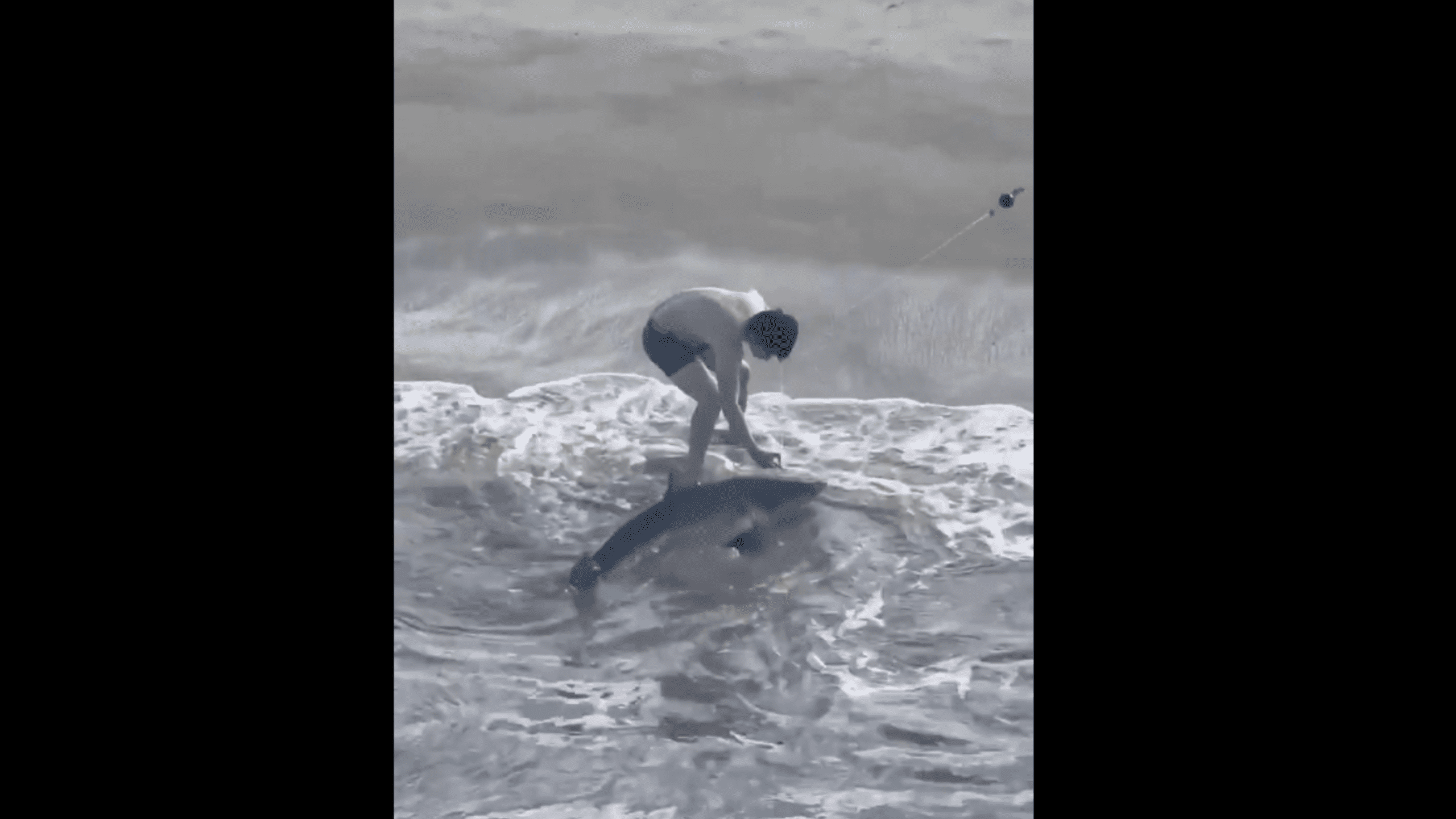 Onlookers captured the moment a man rushed onto a Southern California beach to rescue a shark — reportedly a juvenile great white – that got caught on a fishing line. pic.twitter.com/2CfK3zXdzt