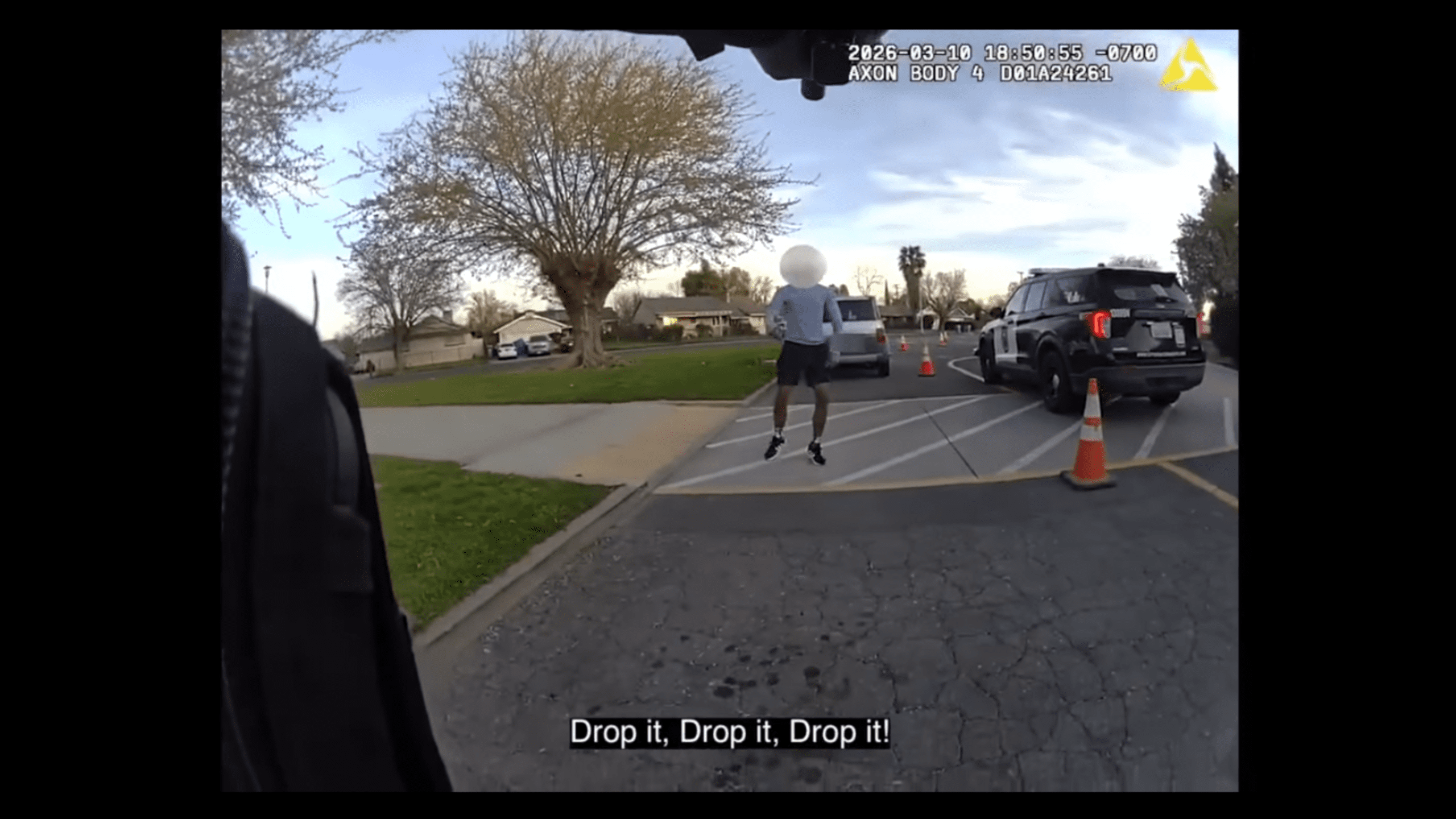 畫面顯示,沙加緬度縣警部直升機首先鎖定目標,見到該男子在校外行走並手持刀具。地面警員其後到場,多次發出口頭指令要求他放下武器。