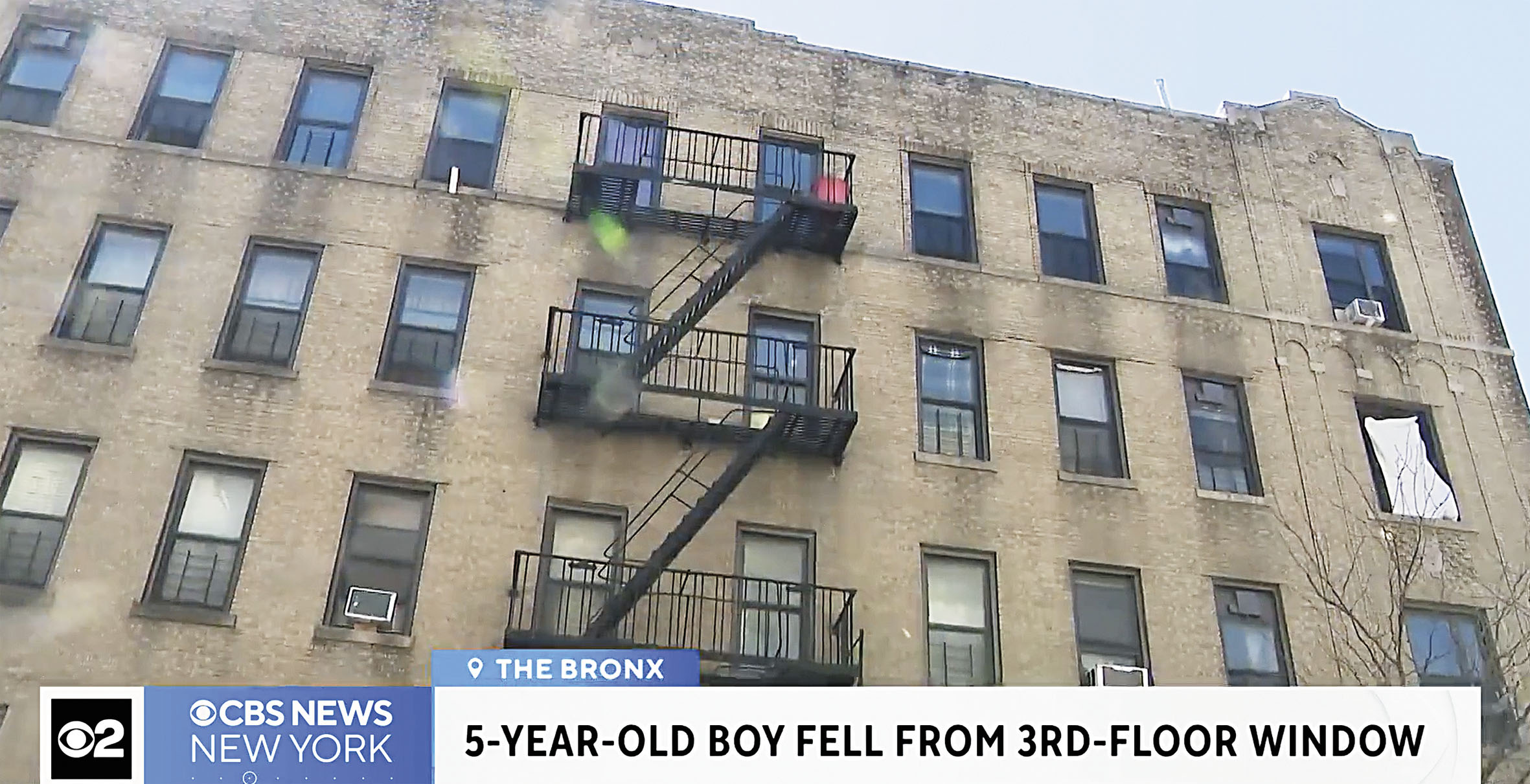 男童從3樓消防梯墜街受傷。  CBS紐約截圖