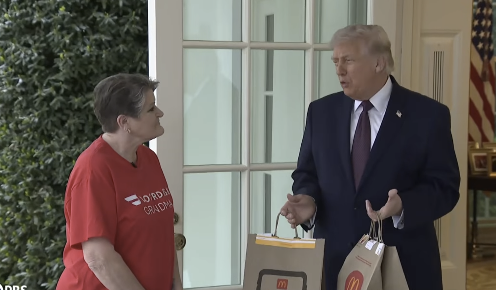 一名身穿「DoorDash 祖母」字樣 T 恤的婦人西蒙斯(Sharon Simmons),週一帶著麥當勞外賣敲開橢圓形辦公室的大門。特朗普在媒體面前親自應門,並幽默地向記者表示:「這看起來不像是安排好的吧?」西蒙斯現場感謝總統,稱小費免稅政策極大地改善了其家庭生活。