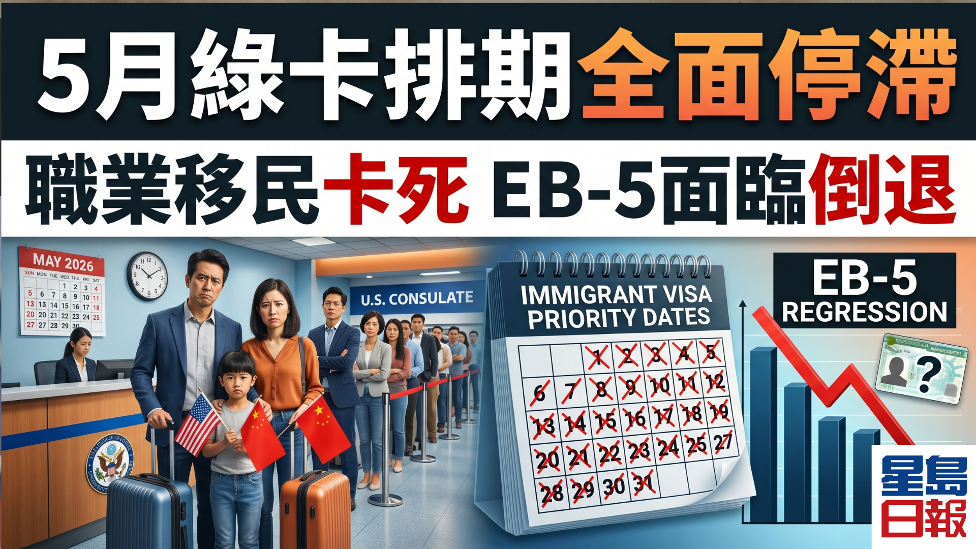 - 核心事件:美國發布五月綠卡排期表,中印職業移民排期停滯,投資移民面臨名額枯竭與倒退預警
