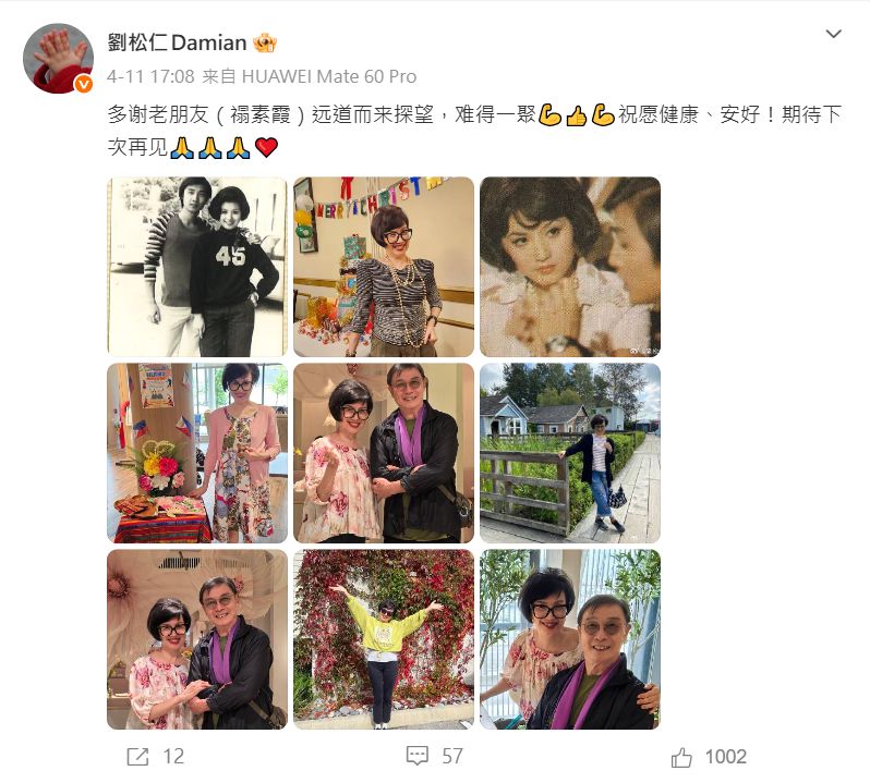 劉松仁日前透過微博發文,貼出多張與老朋友褟素霞的合照。當中既有兩人年輕時的珍貴舊照,也有最近聚會的溫馨合影。劉松仁更「出賣」好友,分享了數張褟素霞的個人生活照。他在帖文中寫道:「多謝老朋友(禢素霞)遠道而來探望,難得一聚,祝願健康、安好!期待下次再見。」字裡行間充滿對老友的關懷。