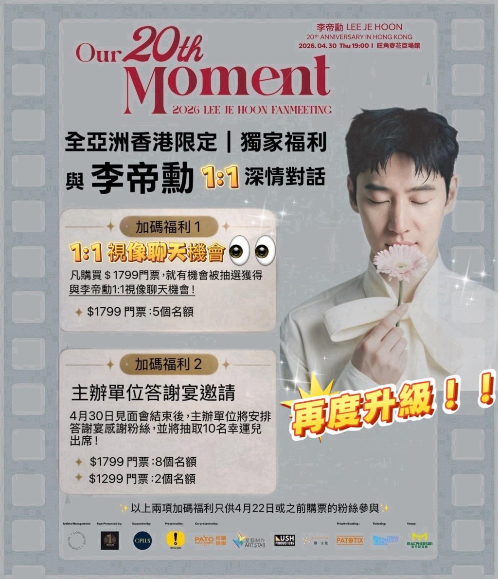 見面會的吸引力近日再度提升。主辦方加碼推出兩項全亞洲僅香港站享有的福利:其一是「1:1視像聊天」,僅5個名額,專屬購買$1799門票的觀眾抽選,獲選者可與李帝勳進行深情對話。其二是見面會結束後的「主辦單位邀請出席答謝宴」,將抽出10名幸運兒參與,其中8個名額來自$1799門票區,餘下2個則從$1299門票區中抽選。這兩項獨家安排,無疑是對香港粉絲的一大厚禮。