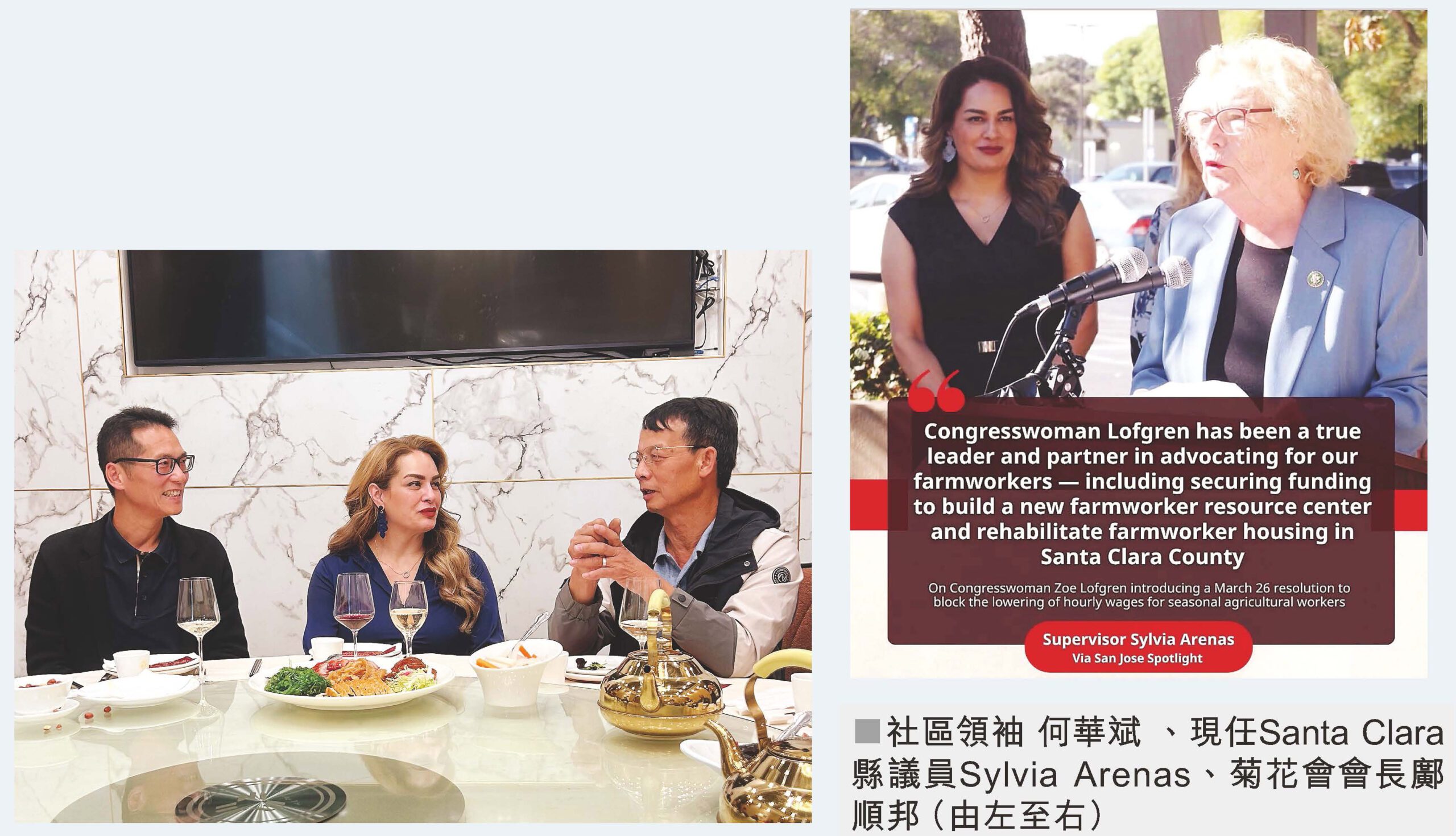 (工商新聞)灣區菊花會上週餐聚 Sylvia Arenas 競選團隊,表達對其競選連任 Santa Clara 縣議員的全力支持。會長鄺順邦親率多位核心成員出席,並特邀社區領袖 何華斌 列席交流。席間氣氛融洽,除聯誼敘談外,亦深入討論菊花會成員在農場與果園經營中所面對的相關法規問題。