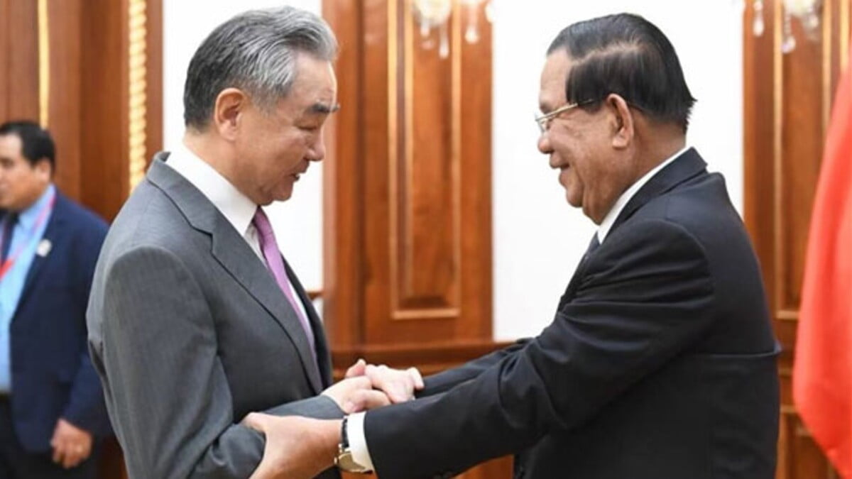 王毅(左)到訪柬埔寨金邊會見洪森。    圖片來源:外交部