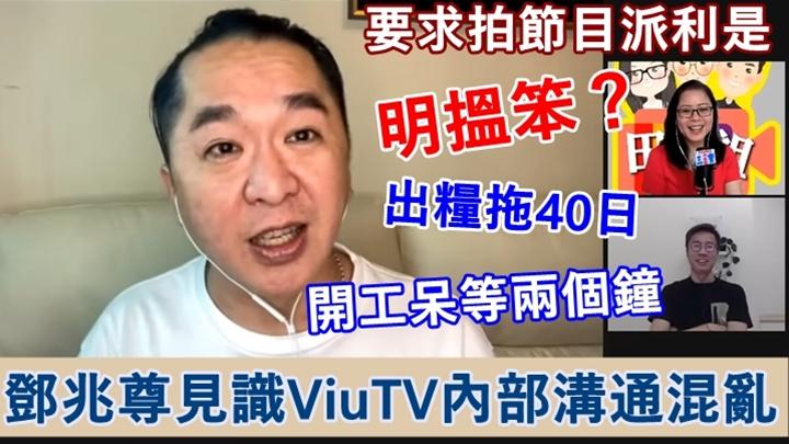 曾志豪及貴花田擔任主持的網上頻道「田祖豪3寶」,昨日(4日)找來鄧兆尊亮相,三人大談電視台的秘聞,不少網民向兆尊提出「娛樂圈Q&A」問題,他除自爆當日入TVB傾約的價錢外,更大爆在其他電視台見過的「無語事件」,當中提到ViuTV溝通混亂,內部管理不及TVB好。