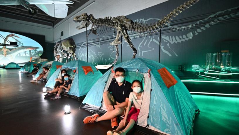 參加者於展覽廳內恐龍化石下架設的帳篷留宿。政府新聞處圖片