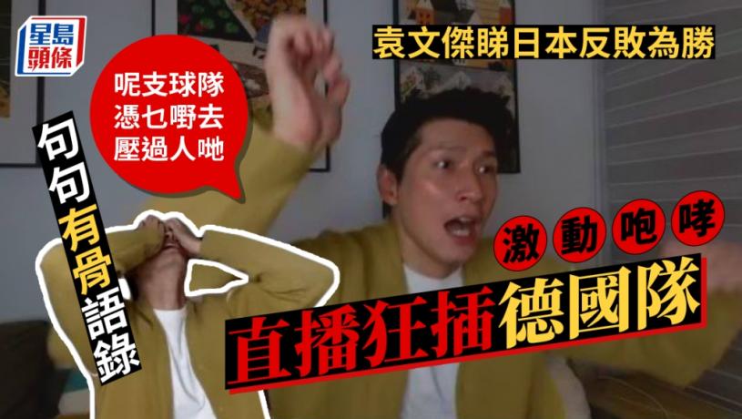而其實在比賽當日,著名阿仙奴球迷袁文傑亦有在個人YouTube頻道上直播旁述該場比賽,初初看見德國隊領先1:0時,袁文傑都非常理性。但當日本隊在短時間內反超前之後,袁文傑亦按不住自己的理性瘋狂大叫,掩面感失望,突然非常激動連聲都沙埋!瘋狂寸爆德國隊,句句有骨,差點就連粗口都忘記用「X」做代替!網民見狀都紛紛叫袁文傑冷靜,笑言擔心袁文傑會「爆血管」!