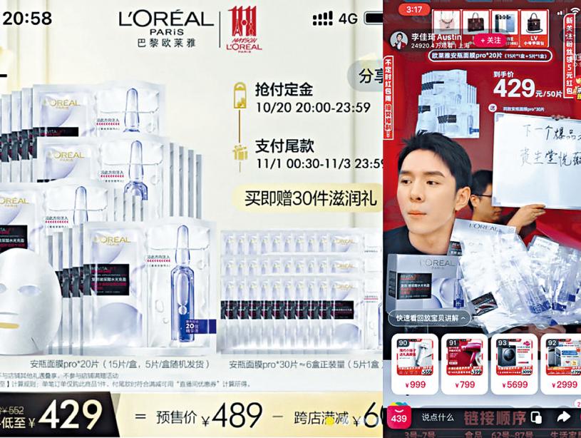 據內地「觀察者」網報道,事緣今年十月底,歐萊雅與頂級網紅李佳琦、薇婭直播間合作,預售一款面膜,五十片售價四百二十九元(人民幣,下同)。支付定金後,消費者十一月一日至三日支付尾款時使用「跨店滿減」優惠券後,則只需付三百六十八點九四元。當時李佳琦、薇婭直播間均聲稱,這是歐萊雅「全年最大力度」優惠。