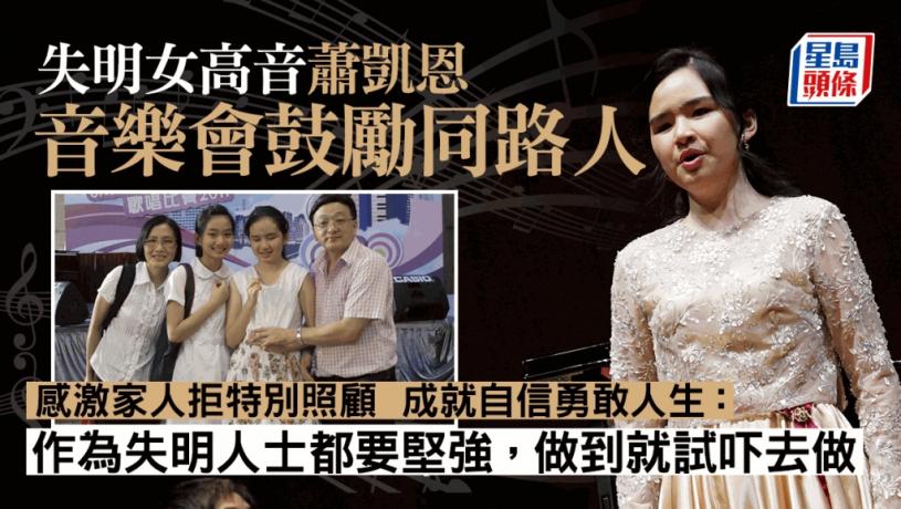 當上帝為你關了一扇門,他同時會幫你開一扇窗。90後的視障女高音蕭凱恩3個月大便因眼癌而摘除眼球,從此看不到有光的世界,但她樂觀面對人生,由牙牙學語唱起兒歌,學有所成作為中大首個音樂系失明畢業生,至今日(18日)獲香港藝術節主辦活動舉辦個人音樂會,她相信心態大於一切,家人待她如「普通人」一樣鞭策鼓勵不斷嘗試,而非收在象牙塔內溺愛保護,成就這樣一個她。「唔好介意人哋講乜,唔好覺人哋歧視你, 『係,我睇唔到嘢!』你問我,我照答。」