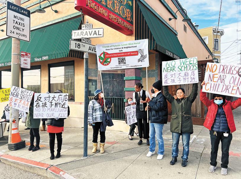昨天下午,雷千紅等日落區居民、住房政策改良會成員、幼兒園負責人、家長,紛紛來到位於Taraval街800號的Gold Mirror Restaurant(金鏡餐廳)門前,舉起抗議牌,堅決反對經營大麻店。