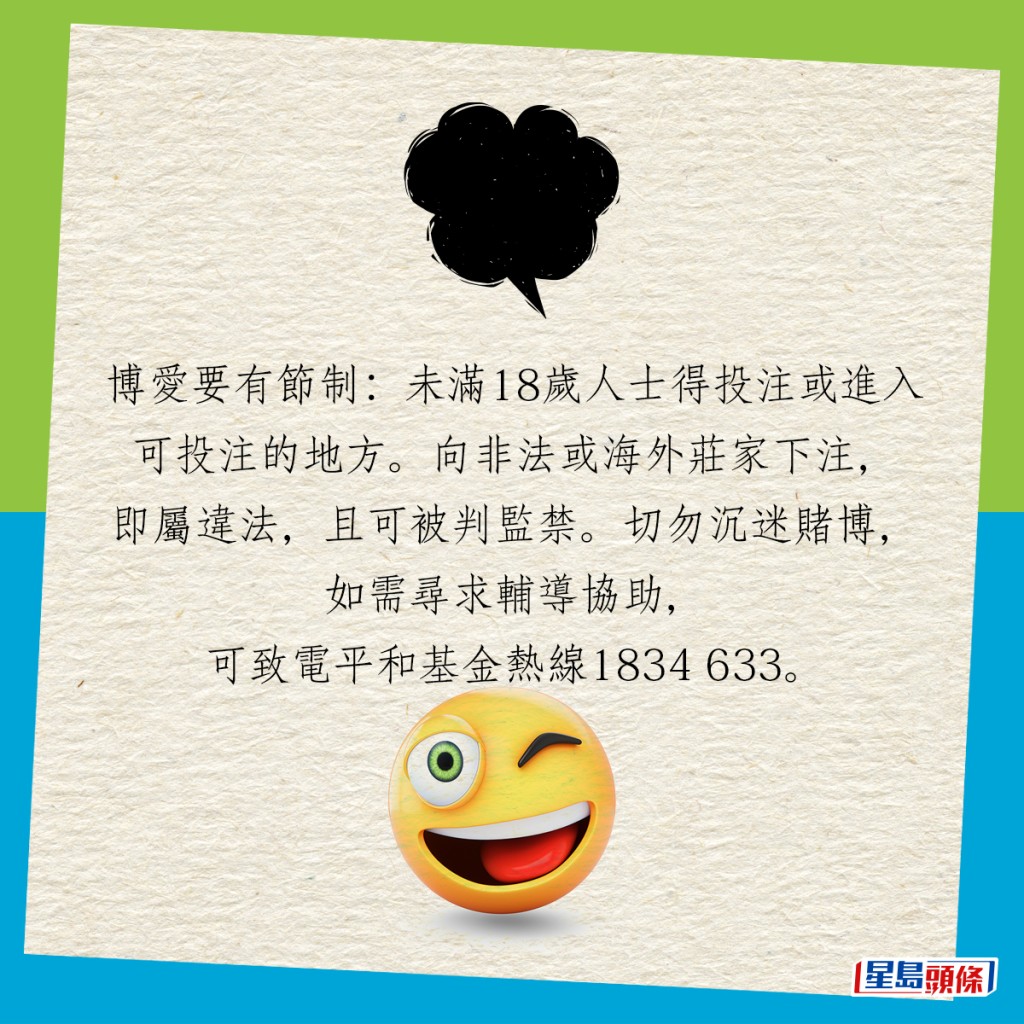 博愛要有節制:未滿18歲人士得投注或進入可投注的地方。向非法或海外莊家下注,即屬違法,且可被判監禁。切勿沉迷賭博,如需尋求輔導協助,可致電平和基金熱線1834 633。