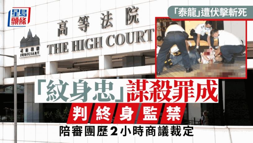 綽號「泰龍」的新義安頭目李泰龍2009年遭仇家伏擊斬死,疑與「泰龍」結怨的和勝和頭目「紋身忠」梁國忠否認一項謀殺罪受審。高等法院法官張慧玲今早引導陪審團指須肯定「紋身忠」曾參與計劃,與他人有共同意圖殺害泰龍或嚴重傷害泰龍,才可裁定謀殺罪成,否則便須考慮誤殺罪。4男3女陪審團今(15日)早上近10時半退庭商議約2小時後,一致裁定「紋身忠」謀殺罪成。張官依例判處終身監禁。