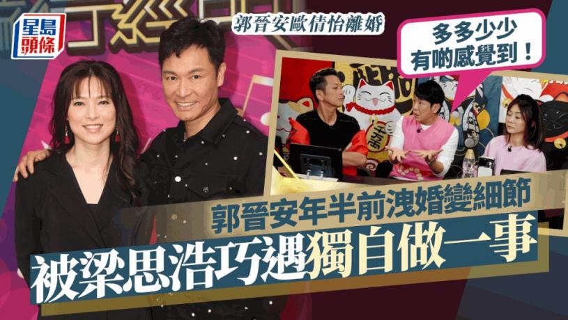 梁思浩稱在某年某月某日知道兩人已經分開,原來他接到朋友來電,對方稱是代朋友找job:「我聽到郭太、郭晉安太太話要出嚟做嘢,你知一個女人突然間要出嚟做嘢,唔多唔少會感覺到啲嘢,我知佢要做嘢嘅原因。」近年歐倩怡重返校園,明顯想轉跑道,更成為營養師,似乎一切早已有準備,不過梁思浩疑替郭晉安抱不平:「我哋上一代啲女人個個係咁,跟咗個老公湊大啲仔女,自然好無聊過埋下半世。你睇出便嘅世界冇話唔得,但係你知安仔而家係半退休狀態,我識得好多嘅娛樂圈中人,依然好恩愛,佢哋會兩個人去旅行,都可以睇到呢個世界,唔一定要出嚟做嘢,同埋佢哋都唔擔心錢。」