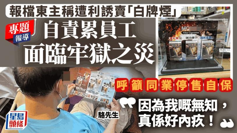 「因為我的無知,導致女員工可能遭受牢獄之災,真的很內疚!」海關早前首度展開打擊「白牌煙」的執法行動,拘捕包括報檔員工等共5人,涉案報檔的東主駱先生日前接受《星島》記者獨家專訪,含淚訴說「白牌煙」「銷售員」去年初謊稱香煙均已完稅,又舉行大抽獎等活動哄騙他入貨銷售,及至其女員工近期被捕後,他要求對方拿出完稅單據以證明報檔清白,結果遭託詞拒絕,更被勸籲認罪了事,當刻終於看清對方的真面目,因此鄭重呼籲同業切勿繼續銷售這些「老鼠煙」,以免成為私煙商的幫兇兼代罪羔羊。