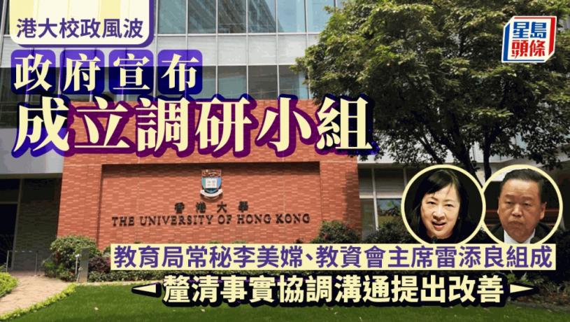 教育局向行政長官建議成立小組,就近期港大內部運作的爭議事宜,進行調查研究,小組的目標是:(一)釐清事實及了解各方問題;(二)協調內部溝通,協助各方配合,加強彼此合作;及(三)按調研情況提出意見,並就改善措施和良好做法提出建議,確保大學按《大學問責協議》的要求運作並妥善運用公帑。行政長官已接納建議。