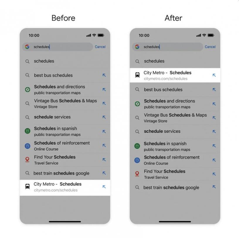 另外,iOS和安卓版本的Chrome將依照搜尋紀錄提供新捷徑推薦。谷歌解釋,若用戶在Chrome輸入「schedules」(時間表),且經常點擊某巴士公司網站,未來用戶再輸入「schedules」時,該家巴士公司的網站就會在搜尋推薦中佔較高位置。