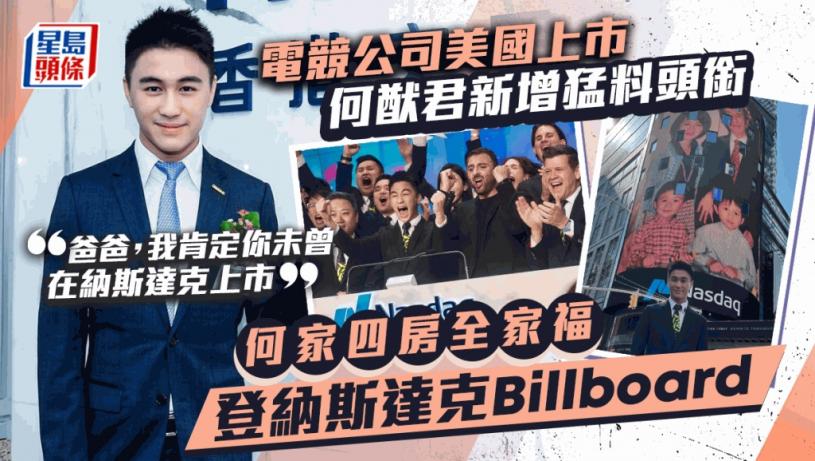 已故賭王何鴻燊與四太梁安琪的兒子何猷君是數學天才,做生意的頭腦不輸爸爸!何猷君持有14.2%的電競公司「星競威武集團(NIP Group)」,上月在美國申請IPO,7月26日正式掛牌上市,他分享感受時,超模老婆奚夢瑤,見證老公的光榮時刻,兩人更在鏡頭前甜蜜熱吻。而何猷君昨日(27日)更在IG分享喜悅,他更將賭王及四太的家庭照登上NASDAQ(納斯達克)大樓的billboard上,更以英文表示:「不是因為你是何鴻燊,而是因為你是敲鐘人的父親,這是我表達感謝的方式。」