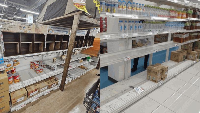 日本宮崎縣8日發生規模7.1強震,氣象廳也發布「南海海槽地震臨時情報」,警告未來一周可能發生巨大地震,部分民眾開始搶購防災用品,有超市商店瓶裝水被搶清光,罐頭區亦如是。專家呼籲保持冷靜,切勿囤貨。