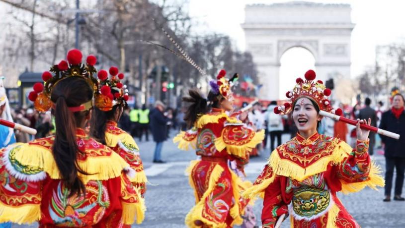 「歡樂春節滿巴黎,龍獅賀歲舞香街」春節巡遊活動周日(2日)在法國巴黎香榭麗舍大街舉行,來自廣東汕頭潮陽的西門英歌隊在巡遊活動中驚艷亮相,讓當地民眾大飽眼福。此前,德國金融中心法蘭克福舉辦首屆春節廟會,潮汕英歌舞隊也在廟會上表演。