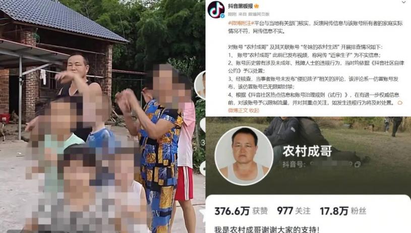 據「抖音黑板報」,平台與當地有關部門對賬號「農村成哥」及其關聯賬號「冬妹的農村生活」開展排查情況如下:賬號「農村成哥」此前已發布視頻,稱網傳「近親生子」為不實信息;賬號歷史曾有涉及未成年、殘障人士的違規行為,當時均依據《抖音社區自律公約》予以處置;經核查,當事者賬號未發布「侵犯孩子」相關的評論,該評論是一仿冒賬號發布,該仿冒賬號已無限期封禁。