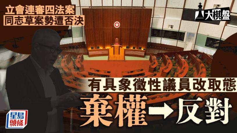 經過暑假休會,立法會今正式復會,隨即審議4項政府法案,依次為追加撥款修例、同性伴侶關係登記制度、籃球博彩稅,以及「控煙十招」修例。當中富有爭議的同性伴侶登記法案,據聞有原先打算棄權的議員改變取態,轉投反對票。