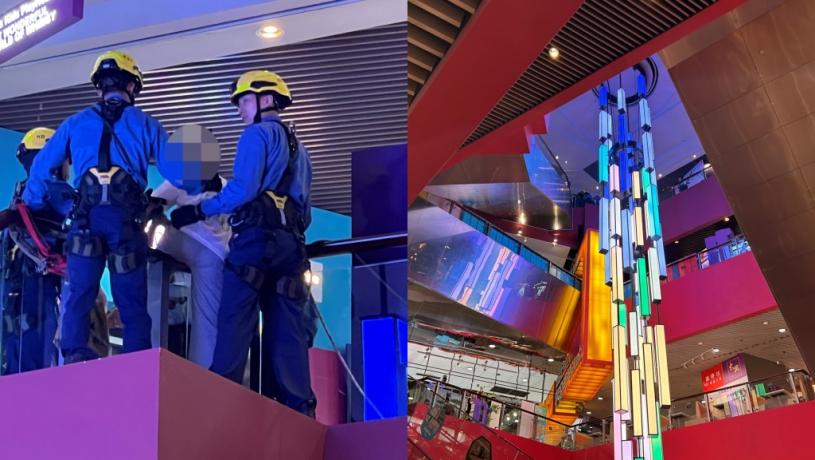 九龍灣Megabox商場內,今日(10月11日)保安報案,表示發現一名女子在12樓欄杆外邊緣危坐,警方消防接報趕至救援。現場所見,事主母親在場憂心如焚苦苦勸說,並將手伸出欄杆試圖捉住愛女。最終,女子返回安全位置,在警員陪同下離開商場。