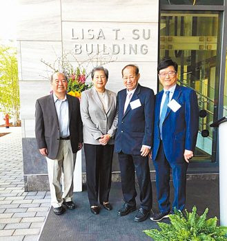 蘇姿丰(左二)在以她的名字命名的MIT大樓前留影。