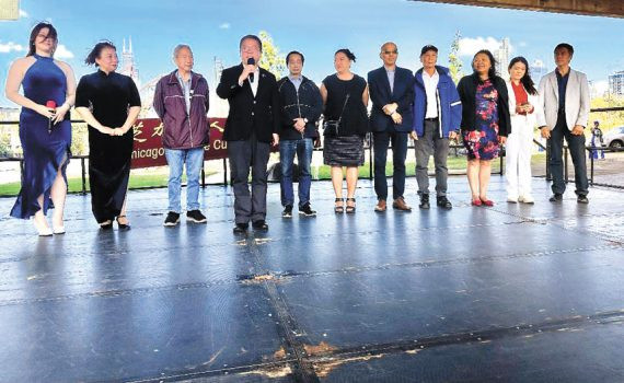 中國駐芝加哥總領館黃黎明副總領事(左4)參與「舞月歌秋」慶祝中秋佳節文娛演出,並預祝所有人中秋節快樂、花好月圓。圖左2為芝加哥人民藝術團團長劉曄。 梁敏育攝