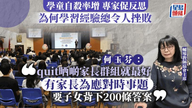 輔導教師協會主席何玉芬指,開學總會為學童增添壓力,認為學校多舉辦不同活動,讓學童感受快樂,有助改善學童精神健康。談到家長的壓力,何玉芬認為最好的方法就是家長自身「唔好睇咁多家長群組嘅訊息,把心一橫quit咗佢」。她指與很多家長溝通,大家心中都明白不想做那麼多比較,「佢哋完全明白,但就係做唔到,因為手機不斷feed緊啲訊息俾佢睇。咁不如狠心啲唔好睇啦。」