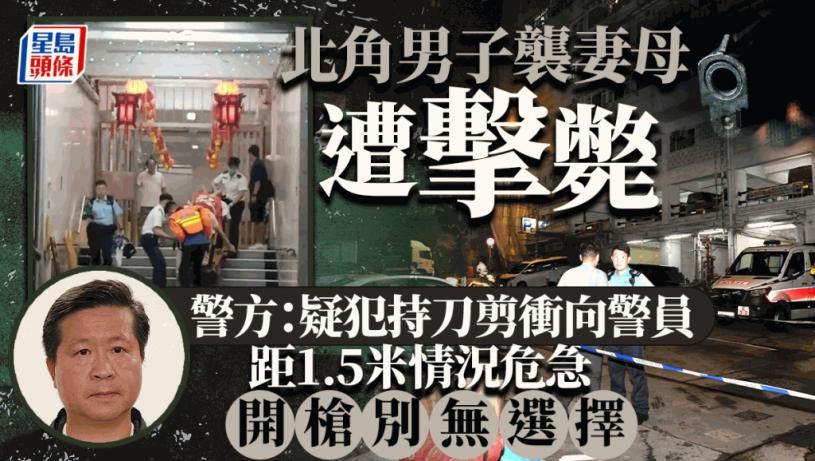 昨日(15日)晚上北角錦屏街63號錦屏樓發生家庭糾紛,一名38歲有精神病紀錄男子懷疑手持利刀及鉸剪,襲擊其母親及妻子。警員到場後他更手持武器逼近警員,經多次警告無效後,男子遭衝鋒隊員開槍制服,送院搶救後死亡。港島總區刑事總部(行動及刑事)警司冼國明交待案情表示,死者有多年精神病紀綠,近日有復發跡象且病情趨嚴重,案發前他把其母毆至骨折,案發時又企圖持刀襲擊警員,雙方距離一度僅1.5米,情況危急。警方認為事件屬不幸,對死者家屬表示深切慰問,並對執行任務警員的表現是適當和專業的,警方予以肯定。
