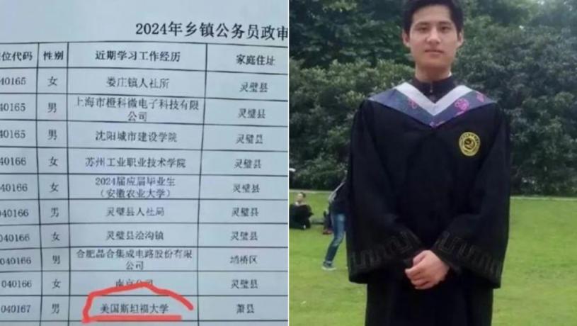 據紅星新聞等內媒報道,安徽省宿州市6月公佈的一份公務員名單中,擁史丹福大學博士學位的蘇朕,獲靈璧縣向陽鎮一個鄉鎮機關錄取為基層事務管理員。