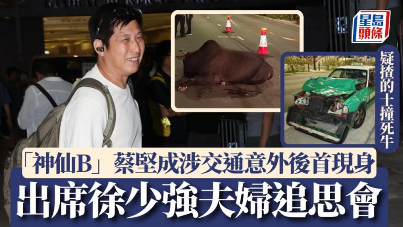 日前馬鞍山西沙路近舊西沙茶座發生交通意外,一部的士意外撞死一頭名為「家慈」的牛。據報涉事61歲的士司機,疑是電影《三五成群》中飾演「神仙B」的蔡堅成。今日(5日)蔡堅成在交通意外後首度現身,出席徐少強夫婦追思會,向徐少強夫婦作最後道別。