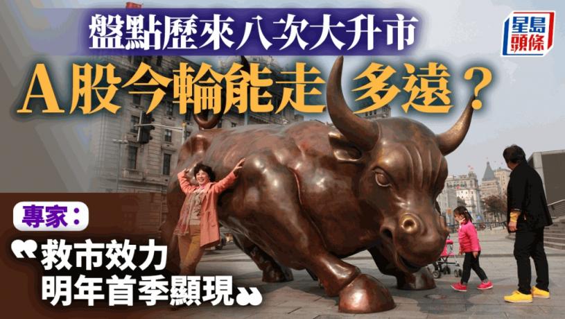 A股周二(8日)在國慶長假期後復市,一如外界預期,滬深兩市甫開市均勁升一成,其後雖然升幅收窄,上證指數周二仍升4.59%,深證則升9.17%。外界最關心,今輪牛市可以去到多遠?回顧A股1990年誕生至今,經歷過8次大牛市,升幅最多一次達到14倍,最長一次持續超過兩年。而對上一輪牛市,受「融資融券(簡稱「兩融」)」提振,上證指數從2014年7月的1974點,升至2015年6月的5178點,維持約一年,升幅達162%。光大證券國際證券策略師伍禮賢指出,以兩融情況判斷,A股仍未及2015年牛市的熾熱水平,並指嚴禁銀行信貸資金違規入市,有助股市健康發展。他估計當今輪中央的經濟刺激政策,效力在明年第一季顯現時,A股可再上一層樓,一浪高於一浪。