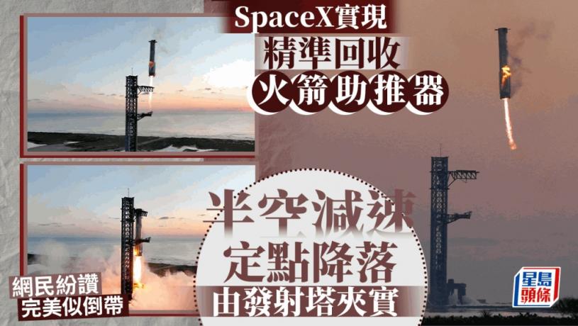 根據SpaceX的現場直播,助推器在完美的控制下返回德州的同一個發射台,一雙巨大的機械「筷子」從發射塔伸出來,讓緩慢下降的助推器停了下來。SpaceX的發言人在直播畫面中說:「各位,這是工程史上值得紀念的一天。」公司員工爆發歡呼聲。SpaceX創辦人、億萬富豪馬斯克在社交平台X發帖說:「發射塔已經抓住了火箭(第一級助推器)!!」他稱巨大機械臂(筷子)為「機械哥斯拉」。