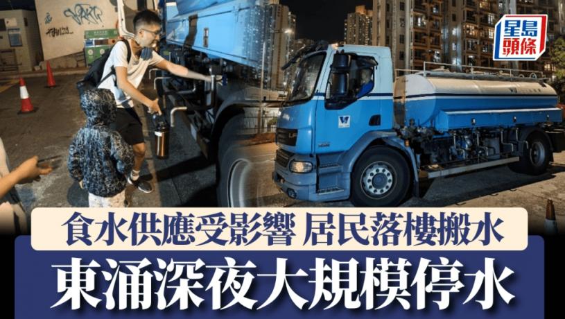 水務署網頁晚上發放的停水通告顯示,全東涌一帶食水及沖廁用食水晚上10時起暫停供應,預計明日(11月4日)早上6時恢復供水,署方於區內多處陸續部署水箱及水車。其中在裕泰苑,有居民落樓至水車取水以備不時之需,稱較早前其實已接獲物管通知停水,故家中已一早儲備相當食水應急。至於北大嶼山醫院,記者晚上10時半左右實測供水暫時正常