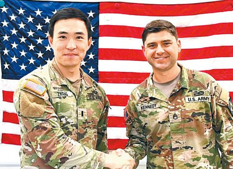 張旭(左)同他的美國陸軍長官握手。