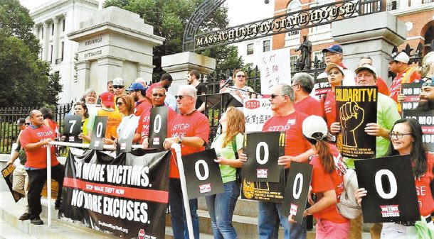 波士頓華人前進會曾經組織過反對盜竊工資的遊行示威,聲討黑心僱主盜竊、拖欠工人工資的惡行。來自十多個團體的約數百名勞工及工會成員參加。遊行隊伍從波士頓市政府廣場出發,途經麻州檢察院,最後在州政府大樓門口集會。抗議者高喊口號,要求消滅盜竊工人工資的行為,支持相關法案的通過。抗議者高舉寫有「反對盜騙工資」、「杜絕更多受害者,不要任何藉口」等中英文標語牌。