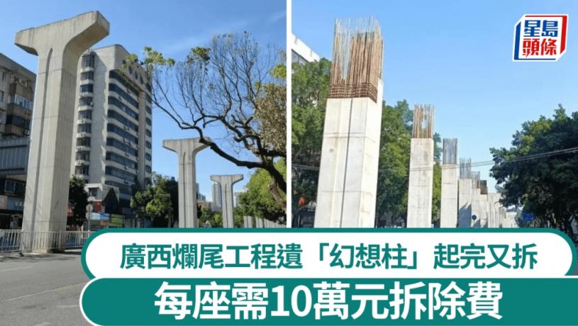 廣西柳州市有多座輕鐵橋墩聳立,延綿數十公里,但上方空空如也,被人戲稱為「幻想柱」。這些橋墩是市內輕鐵工程的一部分,但因為該工程爛尾,這些橋墩也就荒置在市內。最近,因為橋墩影響交通和生活,市方終於決定拆除。惟每座橋墩需拆除費用10萬元(人民幣,下同),被當地居民所詬病。