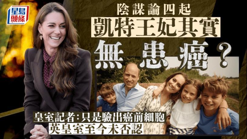 凱特王妃其實無患癌?紐約郵報引述多份英媒報道,一個瘋狂的陰謀論正圍繞肯辛頓宮(威廉王子與凱特王妃居所),事緣有資深皇室記者揭露,凱特根本沒有罹患癌症,只是驗出「癌前細胞」,與患癌屬兩個不同概念。由於英皇室至今未否認報道內容,「凱特無患癌」的傳言愈演愈烈。