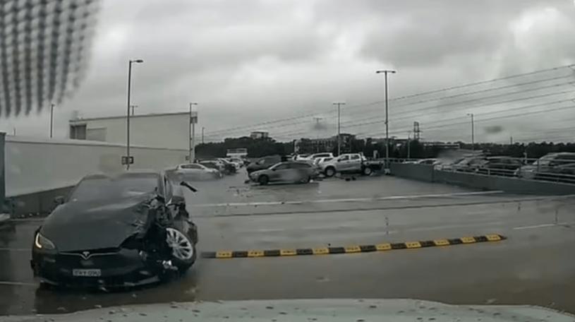 Tesla撞破圍欄,跌落下一層的貨物裝卸區。