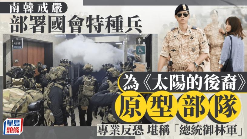 南韓總統尹錫悅3日晚宣布戒嚴令後,部署到國會的戒嚴部隊被韓媒確認屬於南韓陸軍特種作戰指司令部,為熱播韓劇《太陽的後裔》原型部隊。