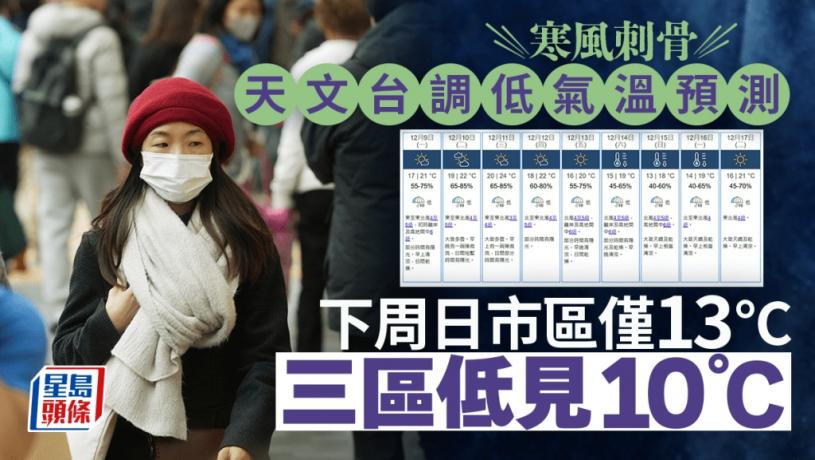 天文台今早預料下周日(15日)氣溫為14至19度,不過,天文台中午時分將九天天氣預報的氣溫,由下周五(13日)起,一連四日的氣溫全部調低1度,下周日(15日)的最低氣溫更跌至13度。而預測下周日上午,部分新界地區如大埔、石崗及打鼓嶺更低見10度,勢成入冬以來最低溫記錄。