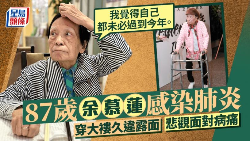 87歲的余慕蓮於2020年患上耳石症,因咳嗽不適入院,揭發有血液炎、肺纖維化問題,一度要入ICU,雖然病情有所好轉,但余慕蓮近年的身體狀況已不復從前。資深傳媒人黃庭桄今晨(14日)在社交網透露余慕蓮最近覆診,醫生指她感染肺炎,並引述余慕蓮表示:「我覺得自己都未必過到今年。」