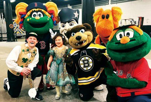 潘美貝爾同凱爾特人隊旗手和吉祥物們合影。 潘潔提供