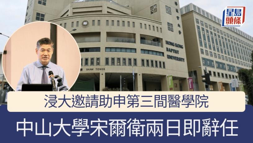 【宋爾衛/浸大/第三間醫學院/中山大學】3資助大學表明有意申辦第三間醫學院。浸會大學於本周一繼科技大學後,公布成立專家諮詢委員會。惟委員會成員之一,中山大學孫逸仙紀念醫院(中山二院)院長宋爾衛,曾捲入多宗醜聞,包括為兒子學術上「走後門」、負責的實驗室學生集體患癌等。委員會名單僅公開兩日,浸大昨日(15日)回覆《星島頭條》查詢表示,宋爾衛由於「公務繁重,難以兼顧各方事務」,辭去委員會職務,自本月15日起不再繼續參與委員會相關工作。