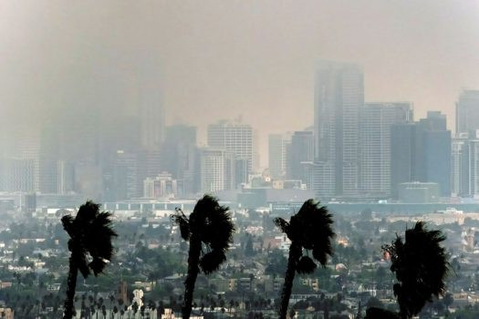 大風吹拂,山火產生的濃煙籠罩著洛杉磯市中心。美聯社