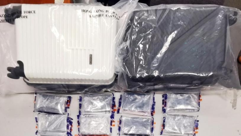 行動中,人員在28歲姓劉本地男子及28歲姓廖內地女子的兩個行李箱內檢獲重約7.7公斤懷疑海洛英,市值約425萬元。該兩名男女涉嫌「販運危險藥物」被捕。
