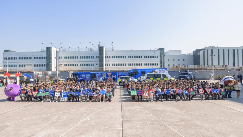 警務處新界南總區聯同九巴、慧賢雅集及香港交通安全隊今天(18日)於機場警署舉行「道路安全日暨巴士車身廣告設計比賽頒獎禮」,目的是加強市民的「單車安全」及「巴士乘客安全」意識,吸引近550人出席。一眾出席嘉賓,在活動開始時以車隊形式進場。