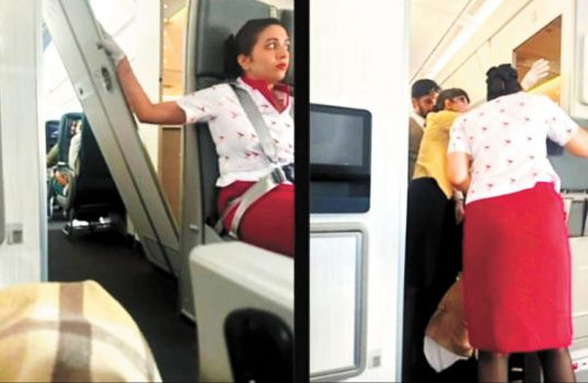 去年7月,香港飛往紐約的航班中,廁所門壞了,空服員只好幫忙扶住。